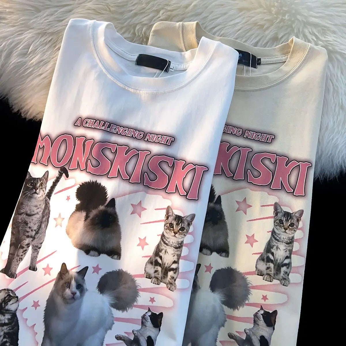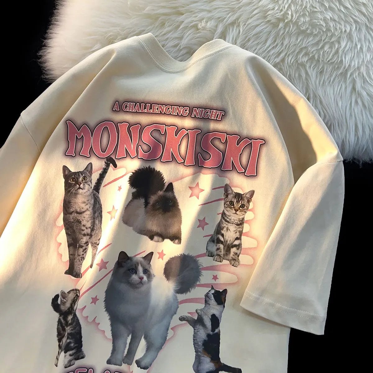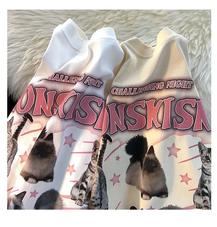 Enter a night of dream with our "A Challenging Night" Cat Mom T Shirts! Made to capture the feeling of a playful and challenging night with your furry friends, this t-shirt features six adorable cats amidst a magical scene of pink starbursts either playing or chilling.