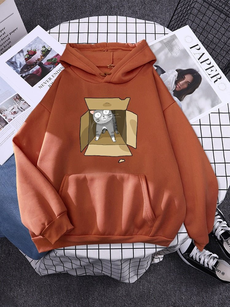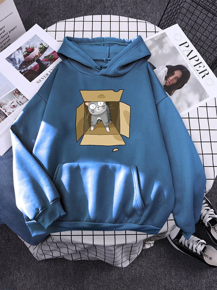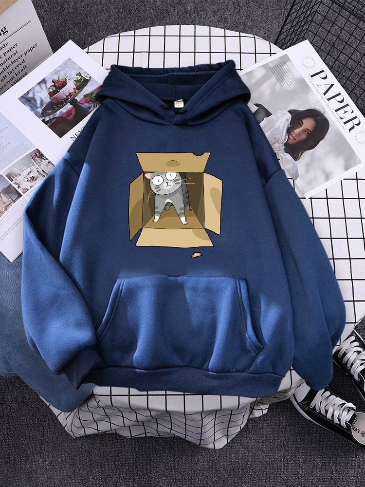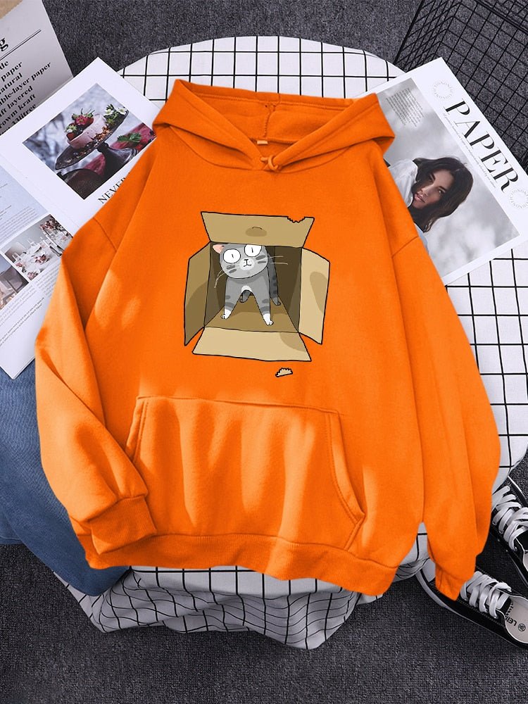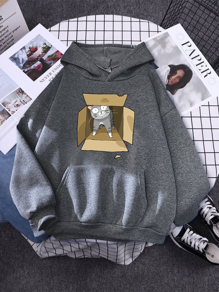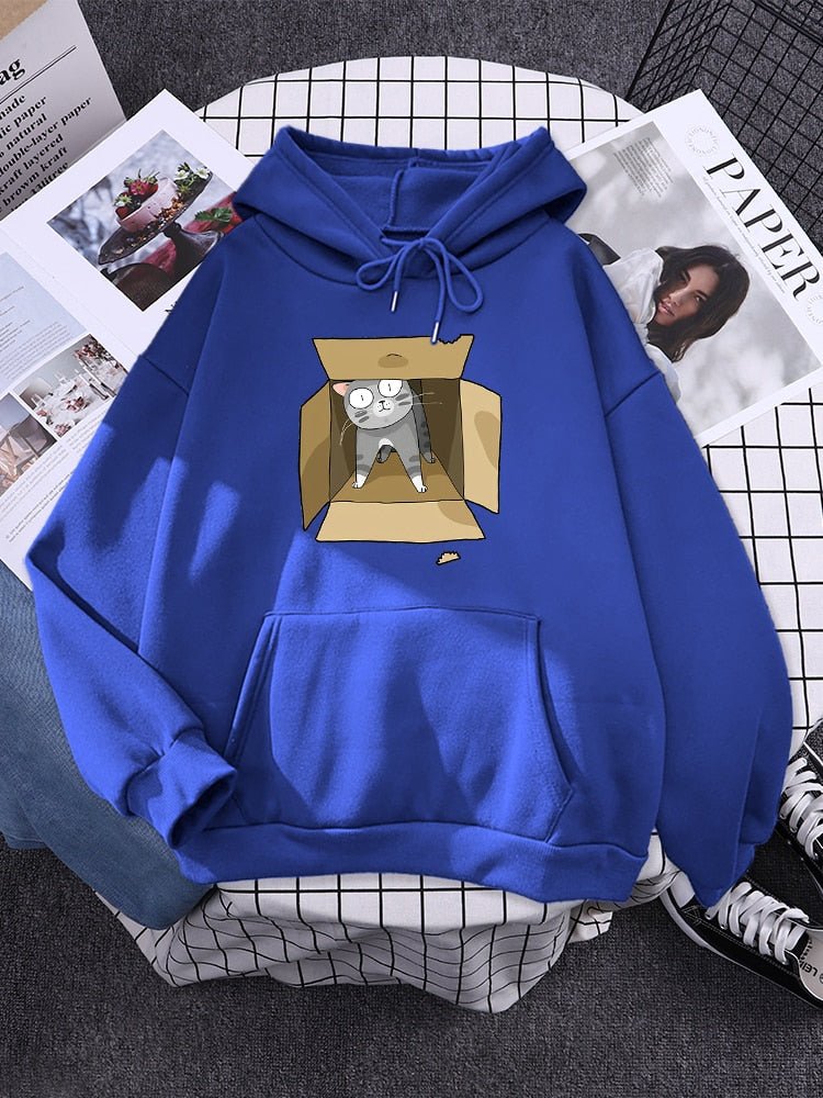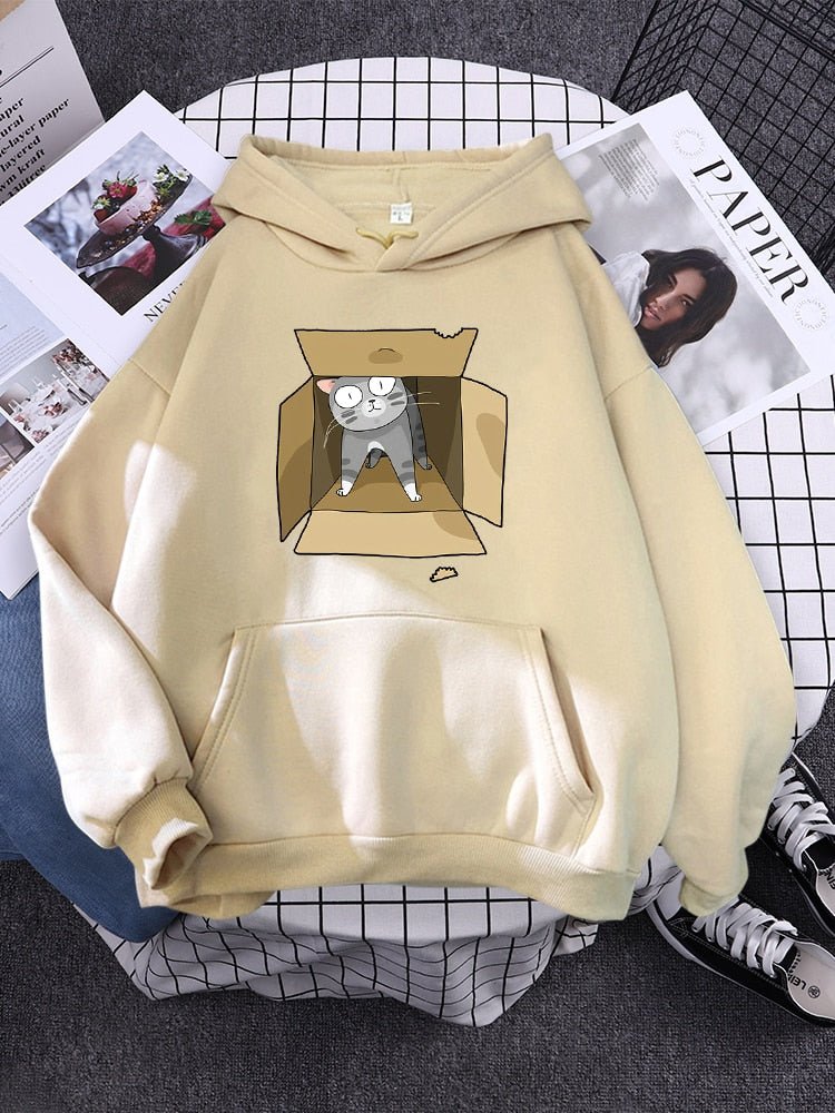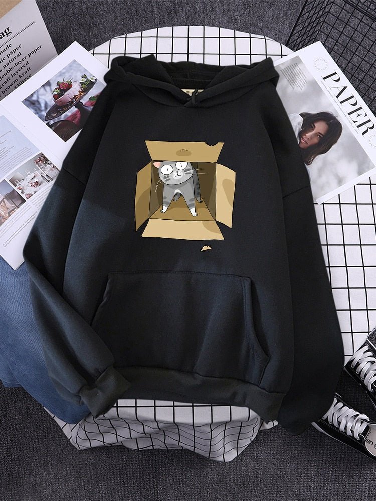 This hoodie is crafted from 100% cotton for all-day comfort. Featuring a gray cat snuggled in a carton box, it's the ideal item for cat lovers. Enjoy the perfect balance of style and function, with a warm and breathable fabric that is sure to keep you cozy.