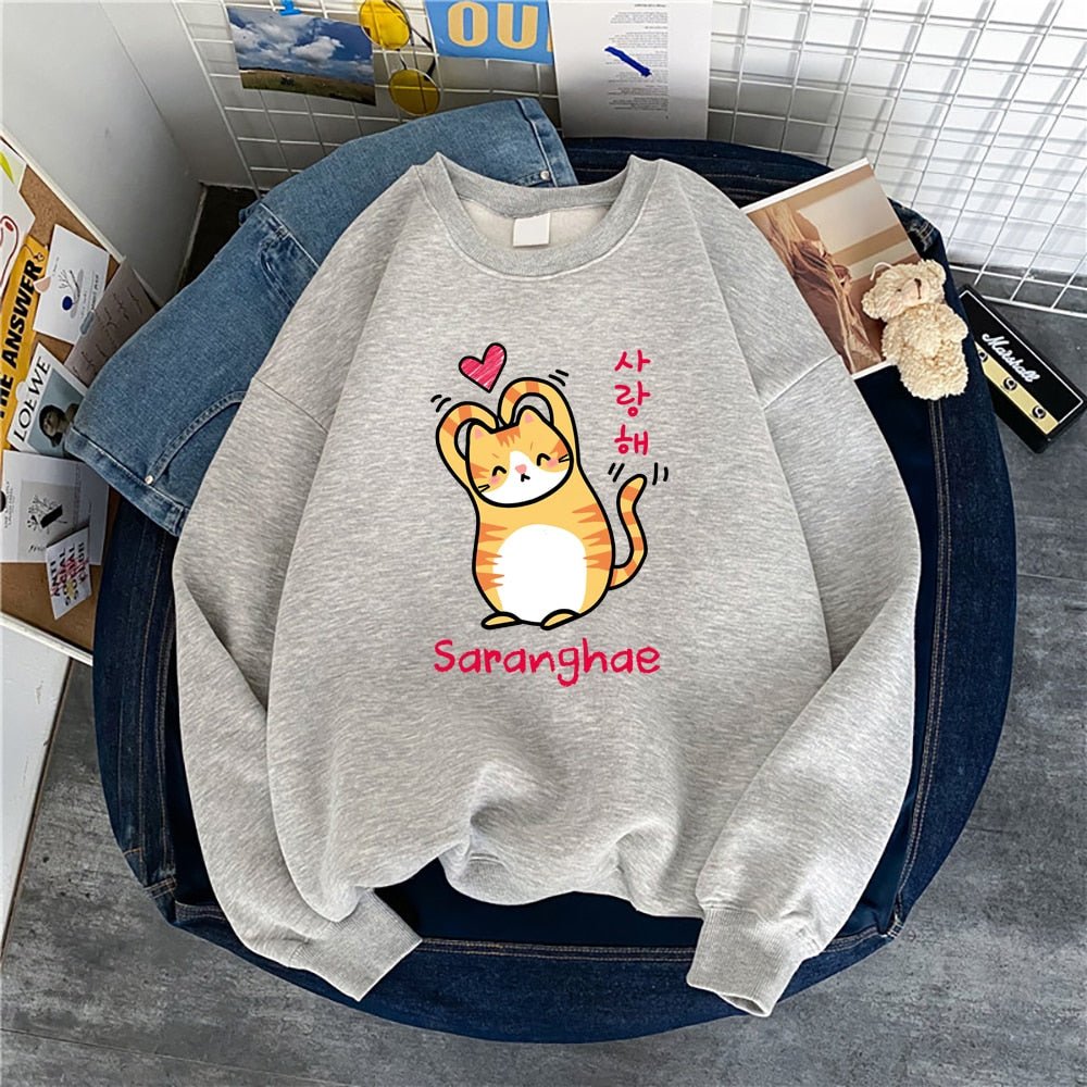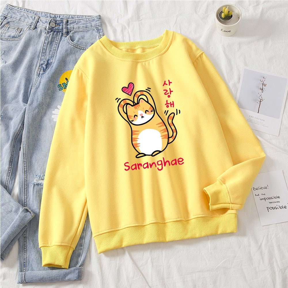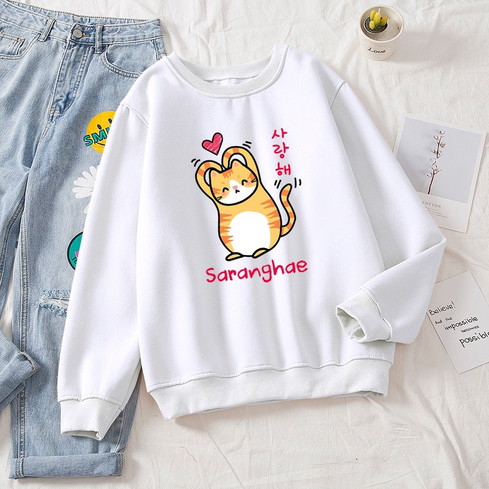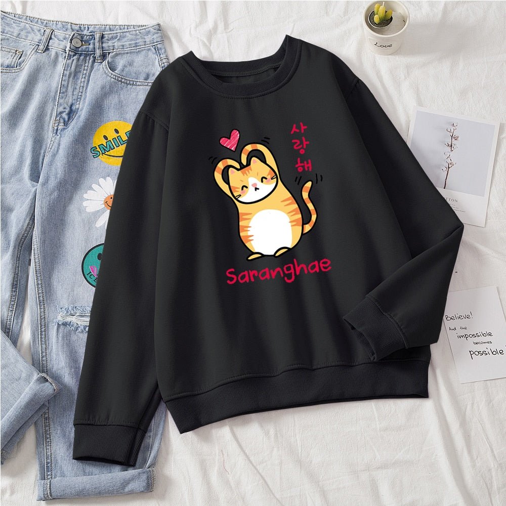 Show the world you love them! Cuter than your average cat, these cute cat sweaters feature a snuggly kitty making a heart with its arms (barely). With bold Korean lettering and a variety of colors to choose from, you'll be sure to find the purrfect style for you! Saranghae!