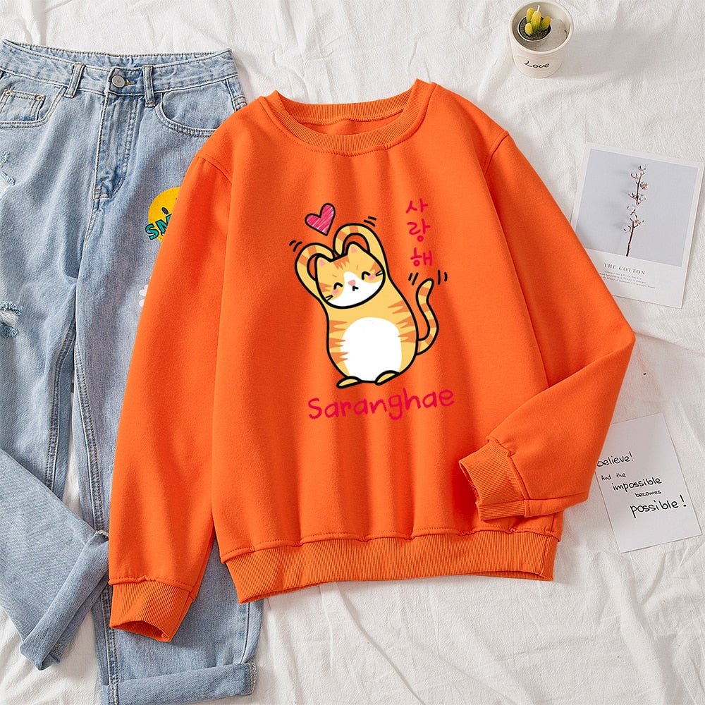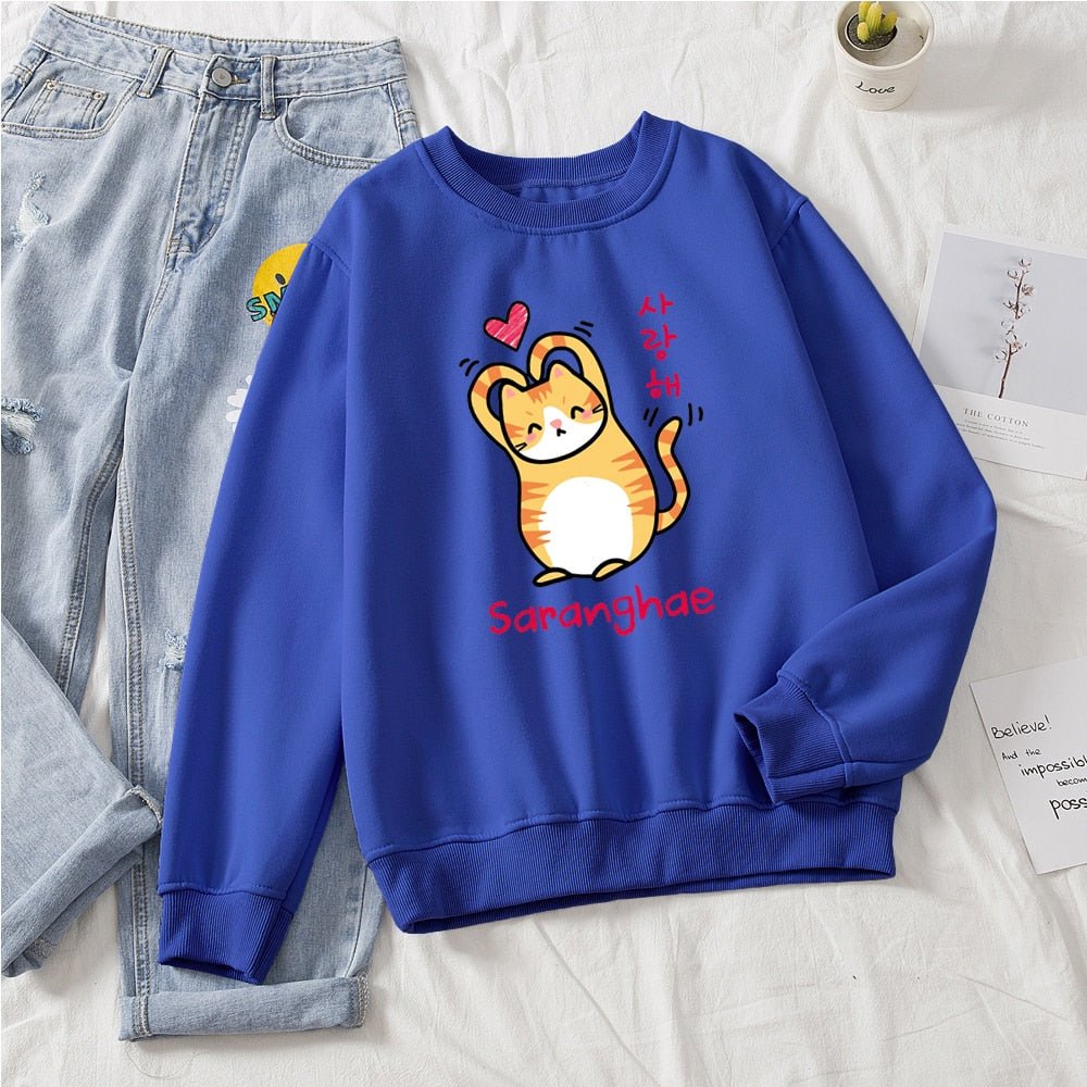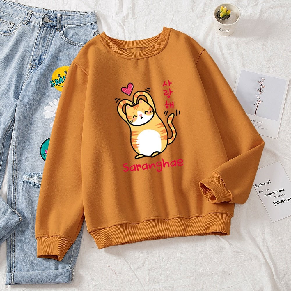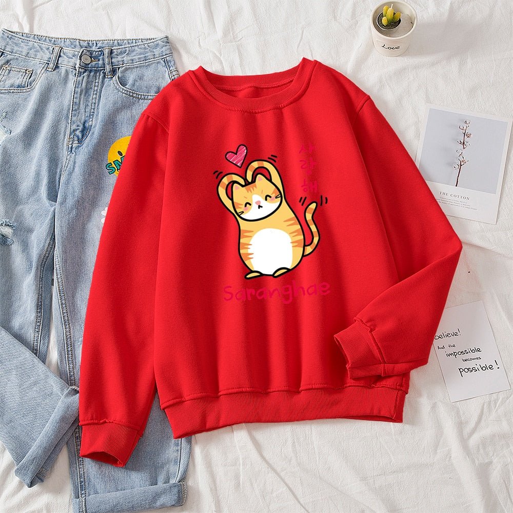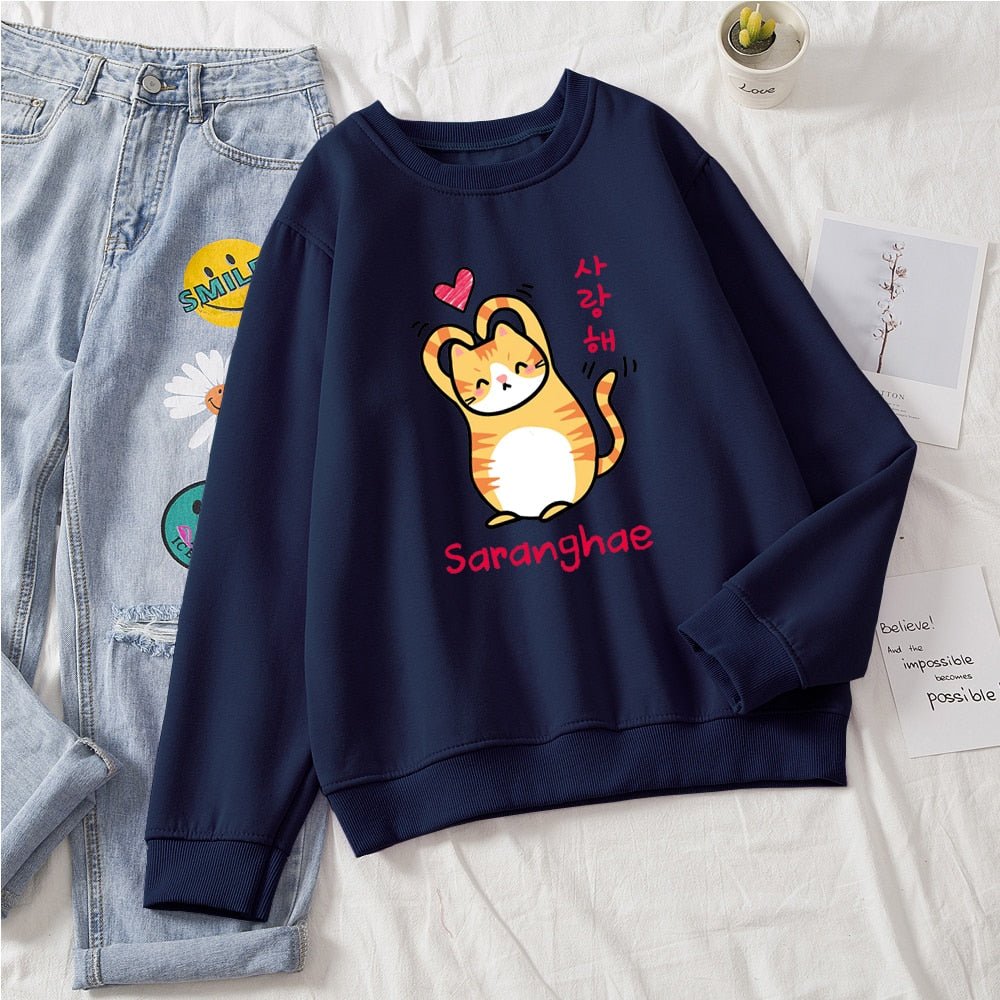 Show the world you love them! Cuter than your average cat, these cute cat sweaters feature a snuggly kitty making a heart with its arms (barely). With bold Korean lettering and a variety of colors to choose from, you'll be sure to find the purrfect style for you! Saranghae!