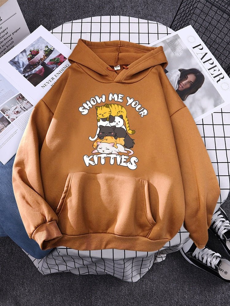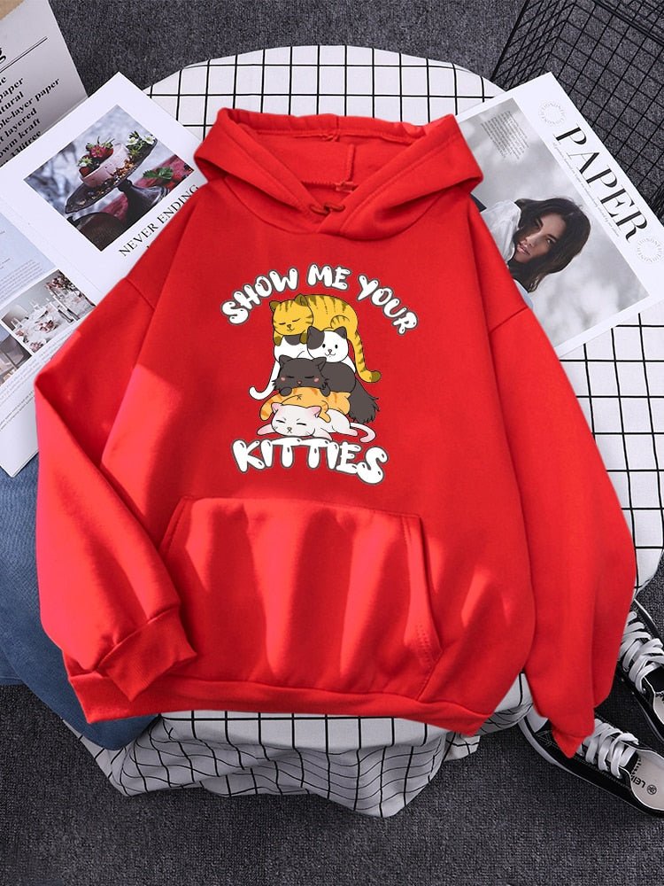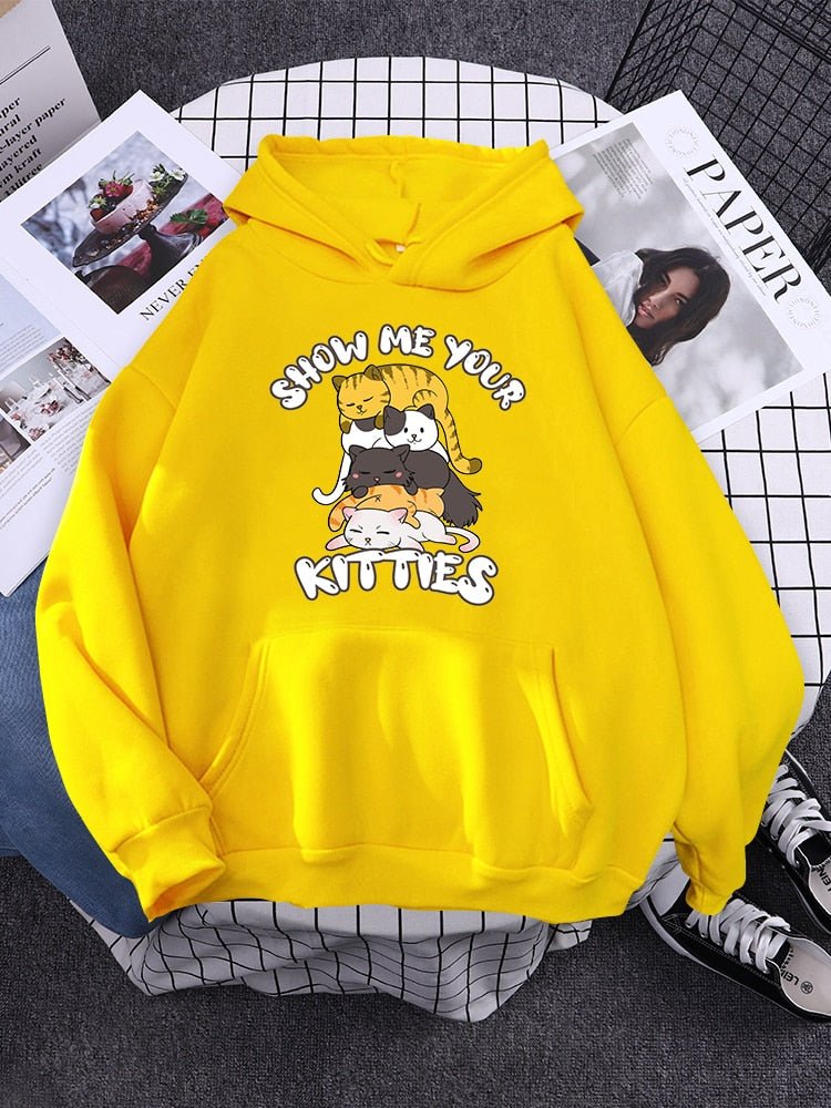 Our "Show Me Your Kitties" Cute Hoodie isn't just a hoodie; it's a conversation starter! Designed with cat lovers in mind, this cute cat hoodie features an adorable print of five kitties stacked together, paired with the playful quote "Show Me Your Kitties."